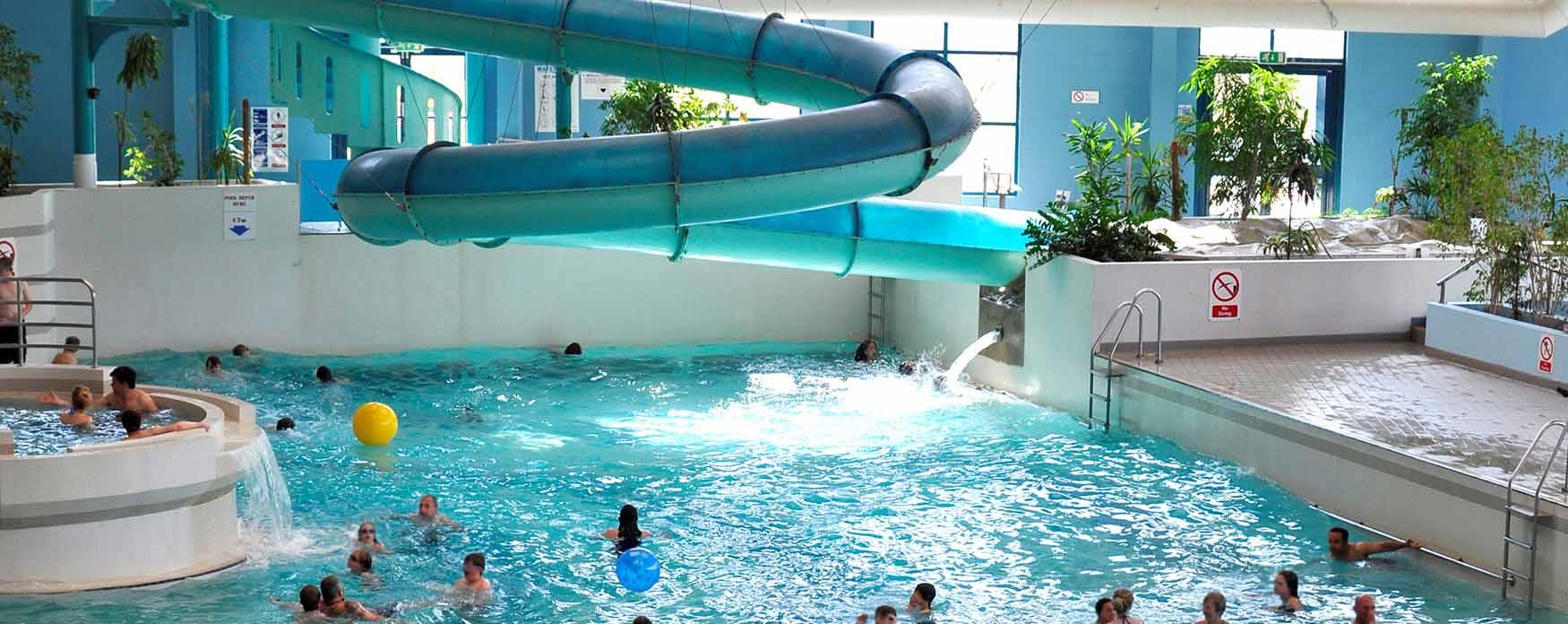 A large swimming pool with adjacent slide and basketball hoops.